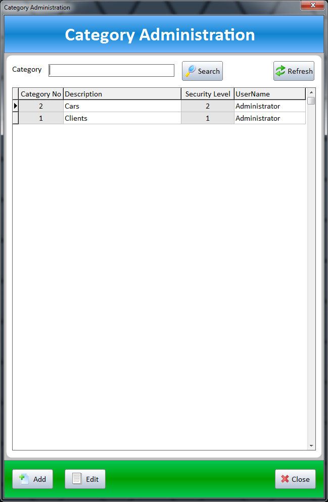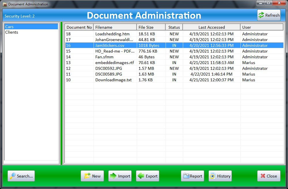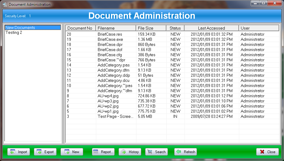 When the administrator logs in, only he can change the passwords, user level access, and add or delete file categories for user access. Only the database administrator has access to the administration settings. Users have access only to the files that have been entered in their access level. All files outside the user's access level, cannot be seen or accessed according to their assigned security level.