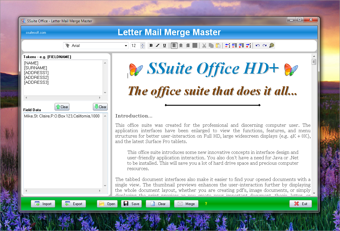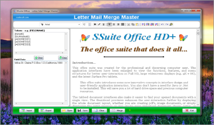 SSuite Mail Merge Master is designed to create one letter or envelope for each recipient from a text draft by using an address or data list. The address/data list is imported as a csv file, that may be created by using any spreadsheet application, or you may add the data inside the data block, and then export it as a csv file.