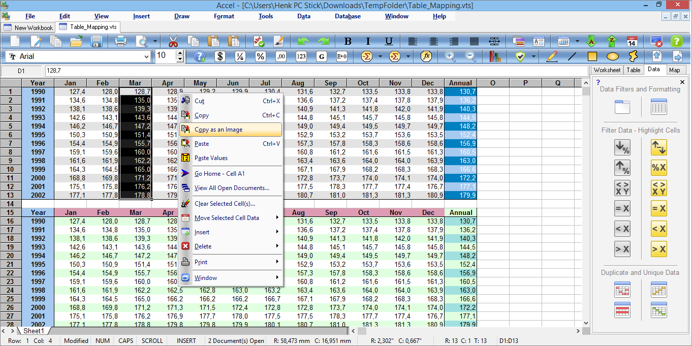 With a few mouse-clicks, you can reorganize your spreadsheet to show or hide certain data ranges, or to format ranges according to special conditions, or to quickly calculate subtotals and totals. SSuite Accel lets you present spreadsheet data in dynamic charts that update automatically when the data changes. Document compatibility with MS Office - { vts, txt, xls, csv }
