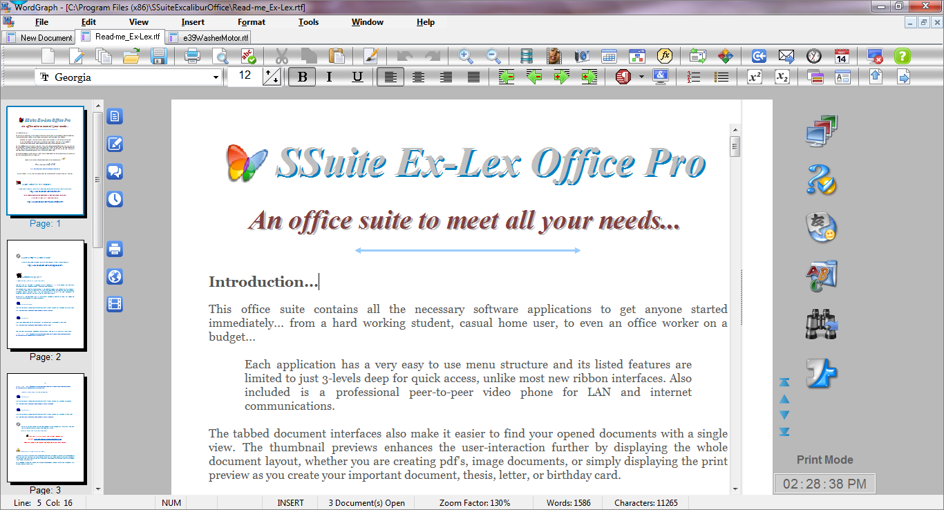 A number of available features give you a fine degree of control over the formatting of text, pages, sections of documents, and also entire documents. You may also save your documents in a variety of industry standard formats and even export them to pdf, jpg, bmp, png, gif, and our own presentation format ssp. Document compatibility with MS Office - { rtf, doc, txt, rtc, ssp }