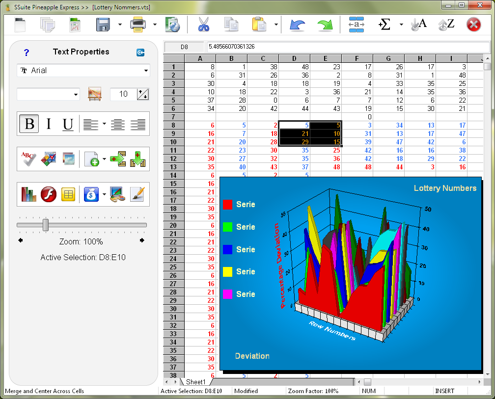 Use the chart wizard to select from eight or more categories of 2-D and 3-D charts including line, area, column, pie, XY, stock and with dozens of variants. Whether you are producing financial reports or managing personal expenses, Pineapple spreadsheet gives you more efficiency and flexibility to accomplish your goals.