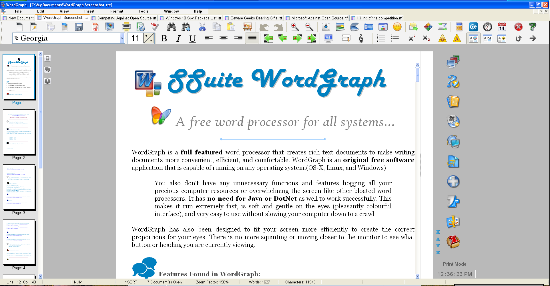 A number of available features give you a fine degree of control over the formatting of text, pages, sections of documents, and also entire documents in WordGraph. You may also save your documents in a variety of industry standard formats and even export them to pdf, jpg, bmp, png, gif, and our own presentation format ssp. Document compatibility with MS Office - { rtf, doc, txt, rtc }