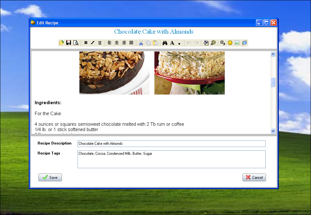 Recipes are entered or modified by using the full featured built-in text editor. One can also import recipes or text from TXT and RTF files. Drag and drop is also supported directly from any other application or web browser.