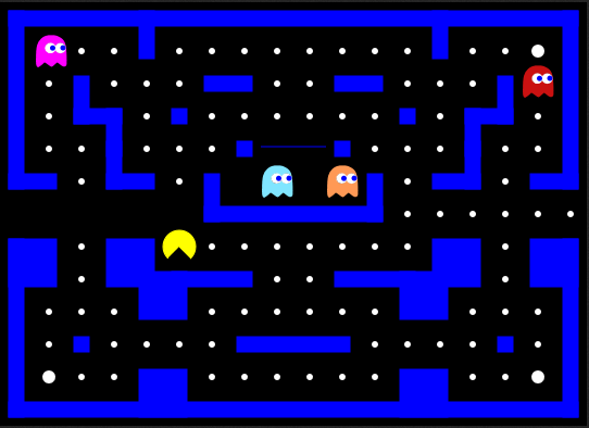 Pinky will start chasing pacman right away, he will always aim 4 fields ahead and 4 fields left of pacman. His home is the upper left corner.