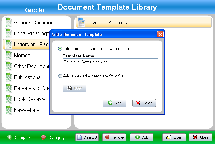 Click on the "Add" button and select the top option to add the current document as a template. Remember to select the appropriate category for your custom template first.